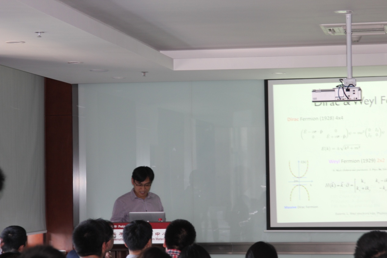本次学术活动以当前学术前沿热点3D Topological Dirac and Weyl Semimatals为主题。新型量子及拓扑态研究创新平台成员贾爽及翁红明分别作了题为“Transport properties of recent discovered Weyl semimetals”及“Discovery of Weyl semimetal in TaAs family”的报告。专题报告结束后,各平台成员进行了自由讨论。
