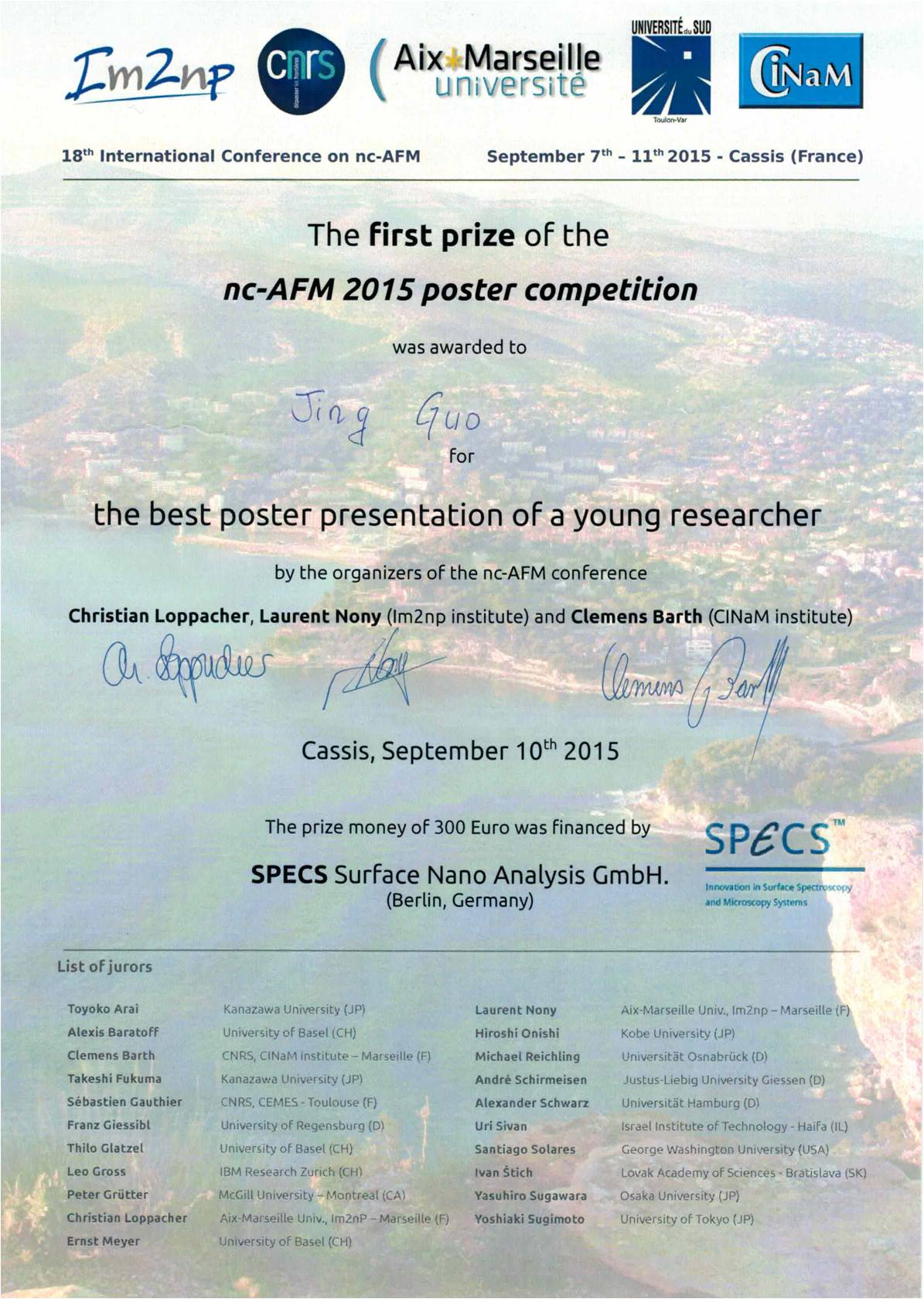 Jing Guo, a PhD student in Prof. Ying Jiang’s group of International Center for Quantum Materials, School of Physics, Peking University, won the first prize of the nc-AFM 2015 poster competition. The 18th International Conference on non-contact Atomic Force Microscopy (nc-AFM) was held from September 7 to September 11 in Cassis, France. The conference was initiated in Japan since 1988 and was held every year at many different countries, such as, Switzerland, Germany, USA, Canada et al. It covers experimental, theoretical and instrumental contributions by means of the different dynamic operation modes used in nc-AFM. Particular emphasis is placed on high resolution imaging, nanoscale manipulation, and force spectroscopy applications used for all kinds of applications in nanoscience. Jing Guo presented the work of “Submolecular-resolution imaging of the interfacial water with combined STM and NC-AFM” in the poster exhibition, which attracted wide attentions and was recognized as the most outstanding achievement out of more than 100 posters by the jurors of the conference.