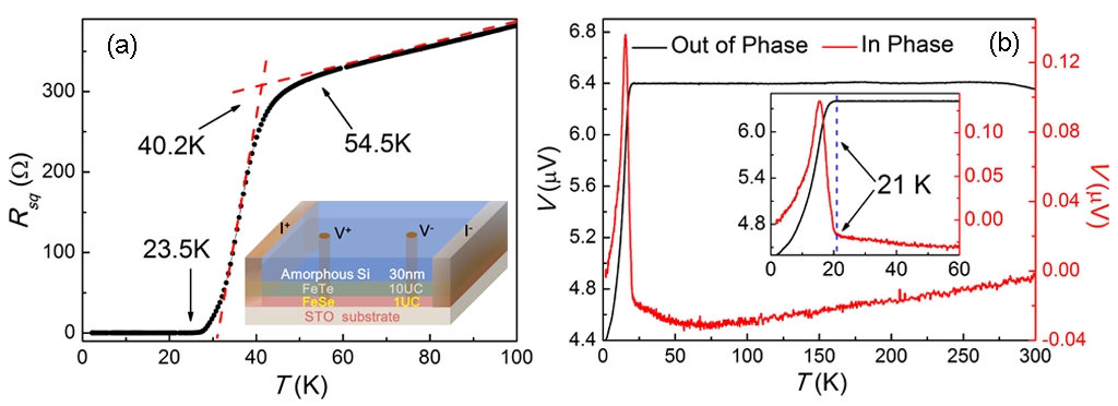 2012年,薛其坤院士与马旭村研究员团队利用超高真空分子束外延技术在钛酸锶衬底上成功制备出单个原胞厚 (0.55nm) 的FeSe超导薄膜。不同于传统理论对超导薄膜的预言(薄膜越薄,Tc越低,在二维极限下因量子涨落超导消失),原位的扫描隧道谱实验在单层FeSe薄膜中发现20meV能隙,如果这一能隙是超导能隙,可以推断其TC可能会突破液氮温度(77K)(Chin. Phys. Lett. 29, 037402 (2012))。要知道,FeSe块材的超导转变温度只有8 K左右,而除了铜氧化物超导体还没有第二种超导体可以突破液氮温度。因次,这一工作很快得到了国内外学术界的广泛关注,中国科学院物理所、复旦大学、中国人民大学、美国斯坦福大学、加州大学伯克利分校、休斯顿大学和日本国家材料研究所等单位的科学家都随后开始了这方面的研究。例如中科院物理所周兴江组和复旦大学封东来组的变温角分辨光电子谱实验研究进一步证实了单层FeSe薄膜中可能存在远大于体相的超导能隙,在65 K左右能隙消失 (Nat. Commun. 3, 931 (2012);Nat. Mater. 12, 605 (2013);Nat. Mater. 12, 634 (2013))。上述一系列重要的实验结果表明单层FeSe很可能是一种新型界面高温超导体。事实上,超导最重要的两个现象是零电阻和迈斯纳效应,相应的实验结果被看作是超导的直接证据。由于单层FeSe很难在大气环境中存活,相应的物性测量极其困难,因此单层FeSe超导的直接证据一直未被报道。