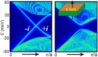 左图:二维拓扑晶体绝缘体受镜面对称性保护的 拓扑边缘态。右图:可以通过外加电场,打开边 缘态的能隙,从而实现电场调控的拓扑边缘态, 为实现拓扑晶体管提供了物理基础。 |