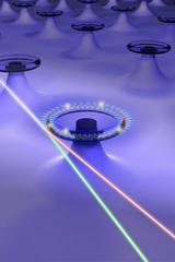 图1: 用于纳米粒子探测的自参考和自差频回音壁拉曼微激光阵列。 “泵浦”激光在微腔中产生一个拉曼模式。当纳米粒子落在微腔上以后,微腔内传播的拉曼光就产生模式劈裂,从而产生了两个不同颜色的新激光模式。通过监测光的频率变化就能够以单粒子分辨率探测纳米粒子。(本图由J. Zhu, B. Peng, S.K. Ozdemir, L. Yang提供) |