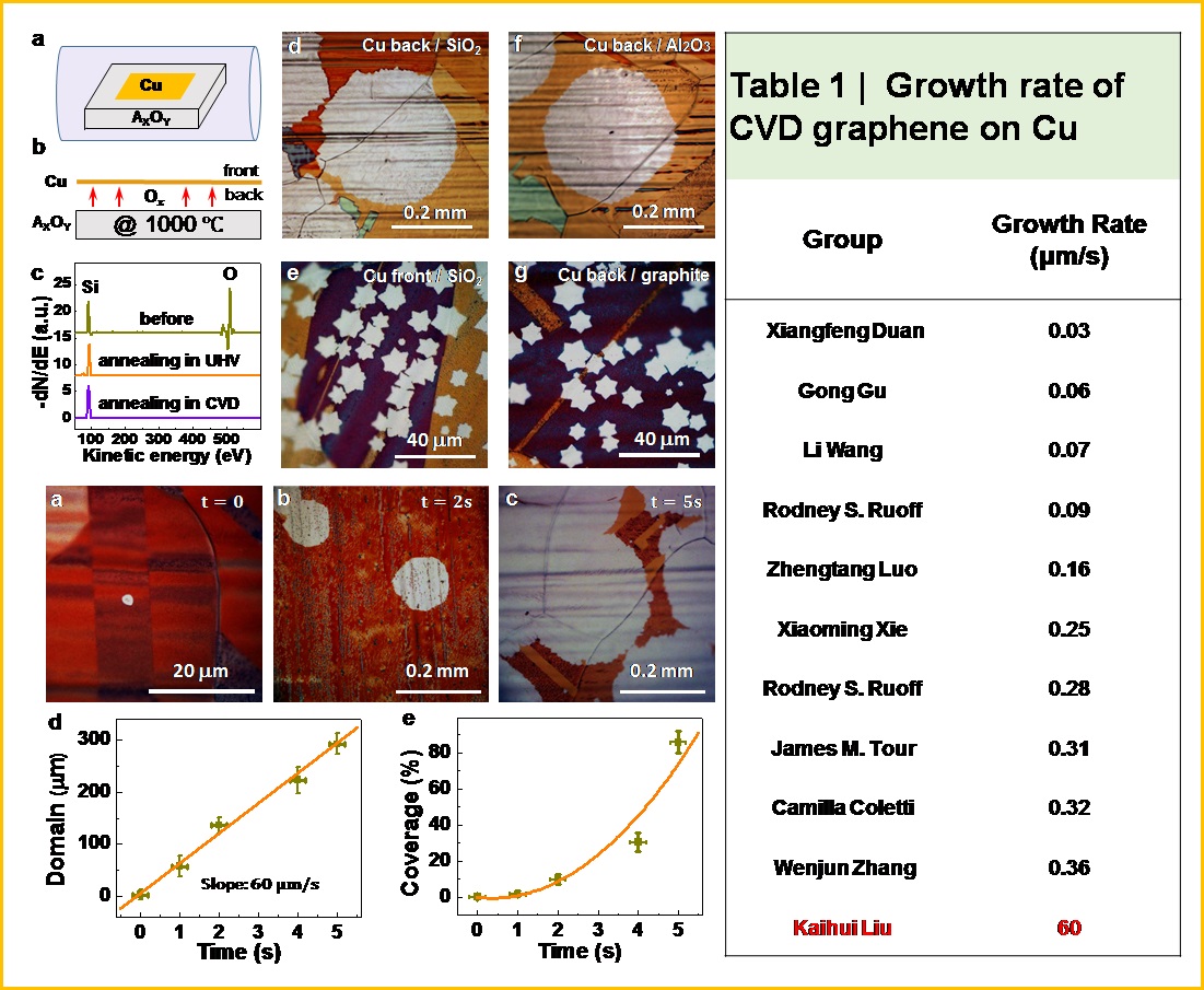左图:Growth of graphene on Cu foils assisted by a continuous oxygen supply。石墨烯单畴的生长速度为60 μm/s;右图:与已有的石墨烯生长速度相比,该研究工作把石墨烯单晶的生长速度提高了150倍。 |