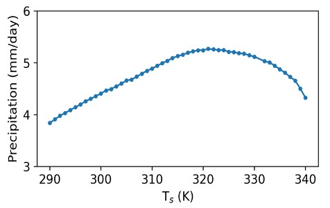 图1.三维大气环流模式模拟的全球平均地表降水量随平均地表温度的变化。全球平均降水是平均地表温度的非单调函数,在极热气候下会随着气候变暖而减少。