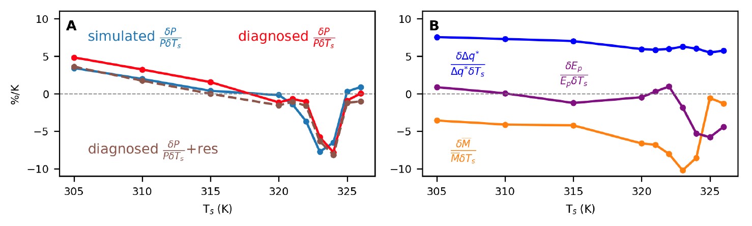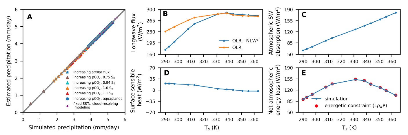 从能量平衡的角度,全球平均降水受到大气能量收支的约束(图3A)。大气通过吸收来自恒星的短波辐射(图3C)、地表的潜热(图3E)和感热(图3D)获得的能量,要与大气向外发射的长波辐射(图3B)平衡。而全球平均降水与地表释放的潜热基本成正比关系,所以全球平均地表降水是受地球大气的能量收支来控制的。其中起主导作用的是大气向外发射的长波辐射(图3B)和大气吸收的短波辐射(图3C)。当地表温度较低时,大气向外发射的长波辐射比吸收的短波辐射随气候变暖增长得更快,所以地表可以释放的潜热随气候变暖而增加,全球平均降水也随气候变暖而增加。然而进入极热气候后,大气会变得非常湿润,水汽几乎可以吸收掉所有地表和大气低层辐射出的长波辐射。在这种情况下,当地表温度持续增加,大气无法增加向外的长波辐射;但由于水汽对近红外波段太阳光的吸收,大气的短波吸收仍然会持续增加,此时根据能量平衡,地表释放的潜热就减少了,全球平均降水也减少了(图3E)。