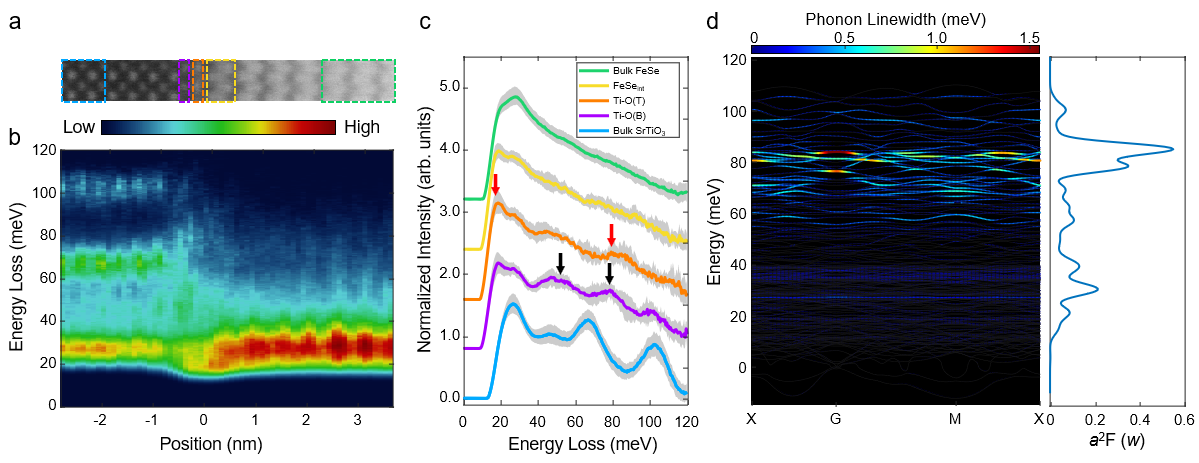 图1. FeSe/SrTiO3界面的原子分辨声子谱以及相应的第一性原理计算结果。(a) FeSe/SrTiO3界面的HAADF图像。(b) 对应的原子分辨电子能量损失谱数据。(c) 从体态SrTiO3(蓝色)、底层TiO终止面(紫色)、顶层TiO终止面(橙色)、界面第一层FeSe(黄色)、体态FeSe(绿色)中提取的声子谱线。对应的提取区域在a图中以虚线框标记。标准差如灰色阴影所示。红色、黑色箭头指示了分别在顶层TiO终止面和底层TiO终止面增强的界面声子模式。(d)由第一性原理计算得出的电子-声子耦合线宽和Γ点的Eliashberg谱函数。