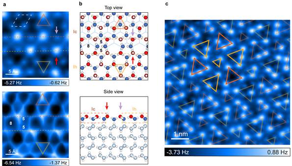 图2. 冰表面的Ih和Ic 晶畴的原子力显微镜实验图(a),对应的结构模型示意图(b),以及周期性超结构的原子力显微镜实验图(c)