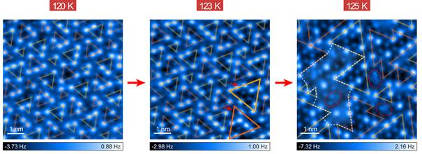 图3. 随着温度升高冰表面预融化过程的原子级分辨成像
