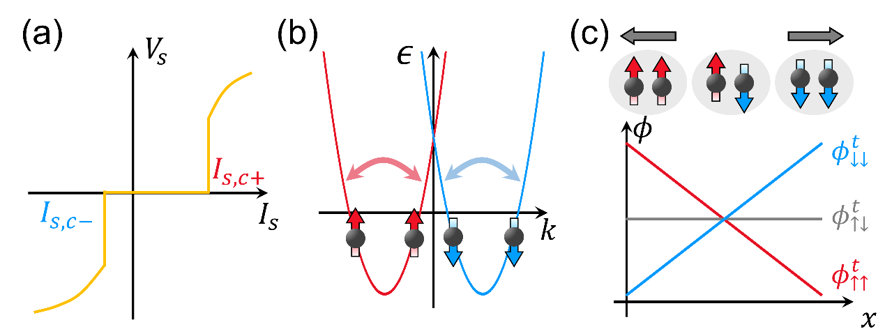 图1 (a)自旋超导二极管效应的自旋流-自旋压曲线示意图,其中正向、反向临界自旋超流不相等。(b)自旋轨道耦合引起的能带劈裂、自旋三重态库珀对的配对方式示意图。(c)不同自旋三重态库珀对的相位梯度和动量示意图。
