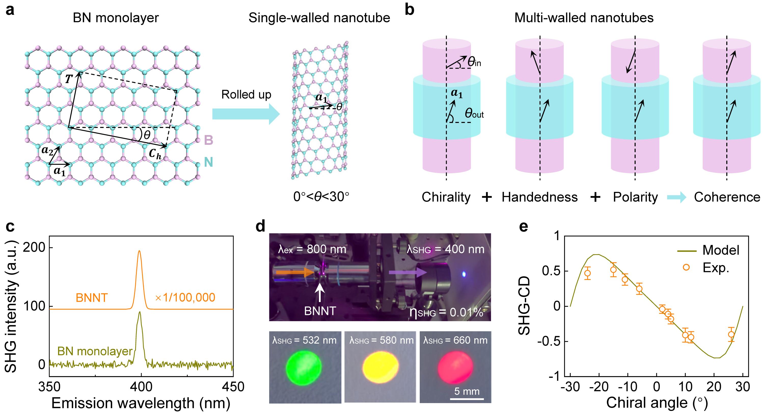 图1. a,二维氮化硼卷曲成一维氮化硼纳米管的示意图。b,相干堆垛的多壁氮化硼纳米管中管壁之间具有相同的手性、螺旋性和极性。c-e,多壁氮化硼纳米管高效二次谐波输出(c-d)和连续可调二次谐波圆二色性(e)。