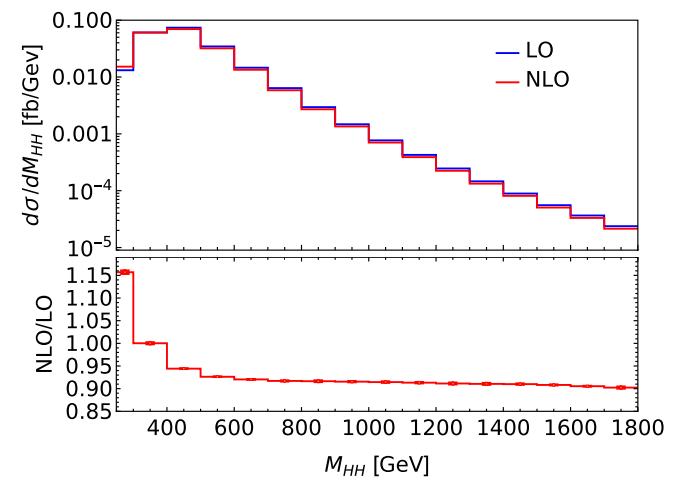 图2:双希格斯粒子不变质量分布的次领头阶电弱修正, √s=14 TeV。