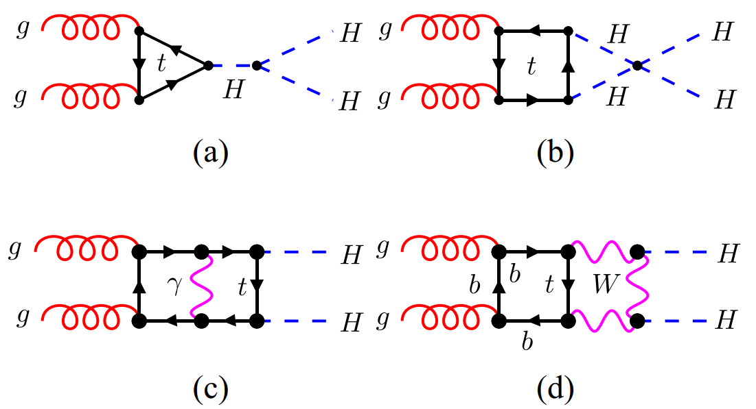 对双希格斯粒子产生截面来说,强相互作用高阶辐射修正导致的误差已经缩小到了5%左右,电弱高阶效应是当前理论预测中的最大不确定因素。次领头阶的电弱修正通常约为百分之几,但是电弱修正会伴随着Sudakov效应,在高能区域的电弱修正能达到10%至30%,必须进行严格计算才能知道其确切值。此外,电弱修正中不仅有三希格斯相互作用顶点(如图1 (a) 所示),还包含四希格斯粒子相互作用顶点(如图1 (b) 所示),从而能够通过电弱修正间接研究四希格斯相互作用顶点的强度。由于该过程的重要性,早在2013年出版的高能物理综述性文章“莱苏什 2013: 万亿电子伏特加速器的物理学:标准模型工作组报告”(Les Houches 2013: Physics at TeV Colliders: Standard Model Working Group Report)中,双希格斯产生的电弱修正就被列入了高能物理理论精确计算的愿望清单。然而,电弱修正具有非常多的质量标度,对理论计算提出了很大的挑战,这个愿望过去十年一直未能完成。