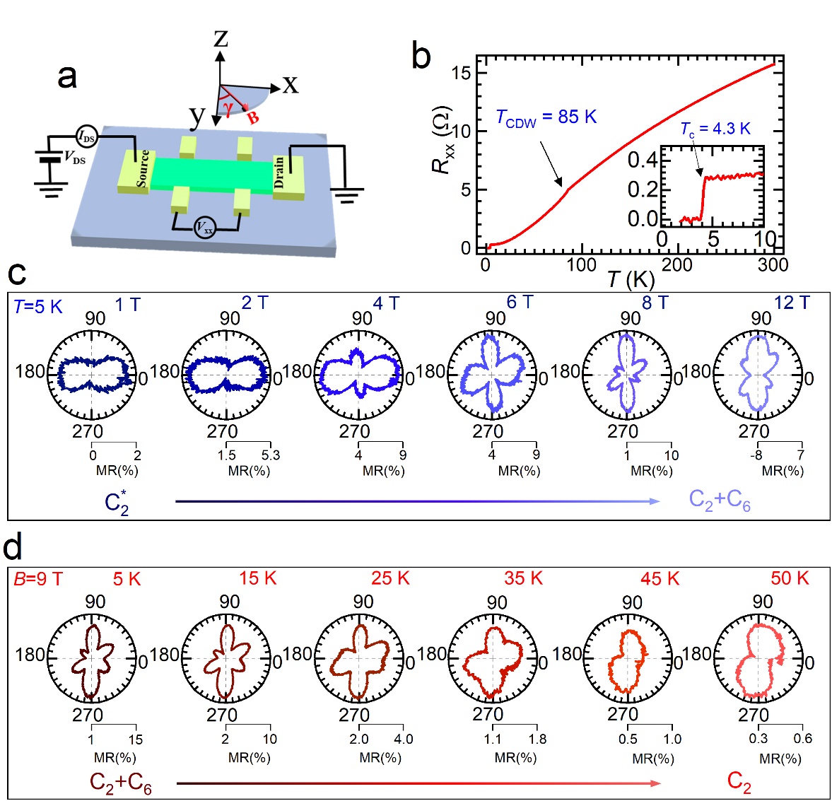 图1 CsV3Sb5面内磁电阻各向异性的磁场和温度依赖。(a).面内磁阻测量示意图,其中电流沿着x方向,γ是磁场与y轴之间的角度。(b).零磁场下, CVS样品的电阻-温度曲线,温度范围:2K到300K。电阻-温度曲线在85K处的拐点对应着CDW相变,插图是2K到10K之间电阻-温度曲线的放大图,显示在4.3K发生超导转变。(c),(d).面内磁阻与γ的极坐标图。图c是温度为5K时的数据,磁场大小依次为1,2,4,6,8,12T;图d是磁场是9T时的数据,温度依次为5,15,25,35,45,50K。