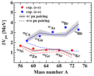 欧冠官方网站研究团队建立了统一考虑中子-中子和质子-质子以及中子-质子对关联、严格处理堵塞效应、保持粒子数守恒的相对论多体理论方法,微观自洽处理中子-质子对关联,成功再现了中国科学院近代物理研究所观测到的原子核结合能双重差分的反常分叉现象,揭示了原子核中存在中子-质子对关联的信号。