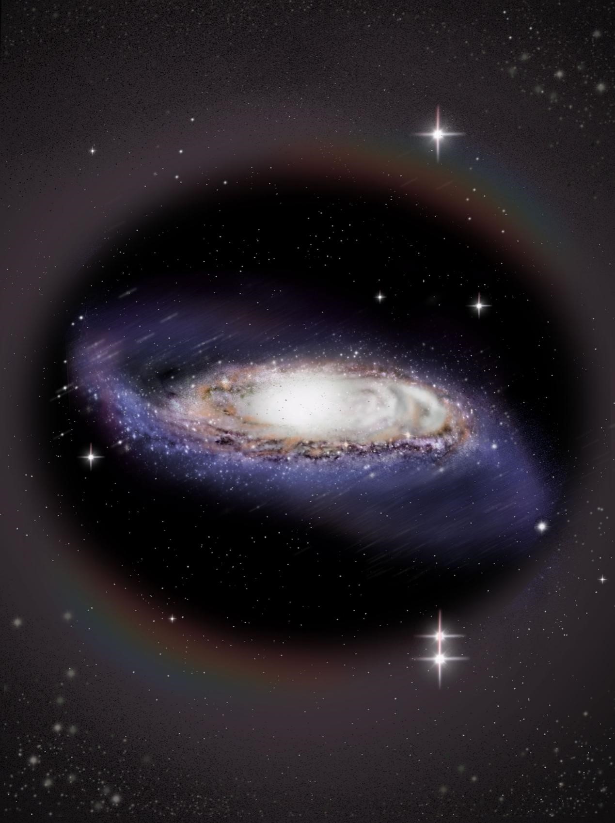 艺术想象图:银盘翘曲在暗物质晕的力矩下“翩翩起舞”(进动)