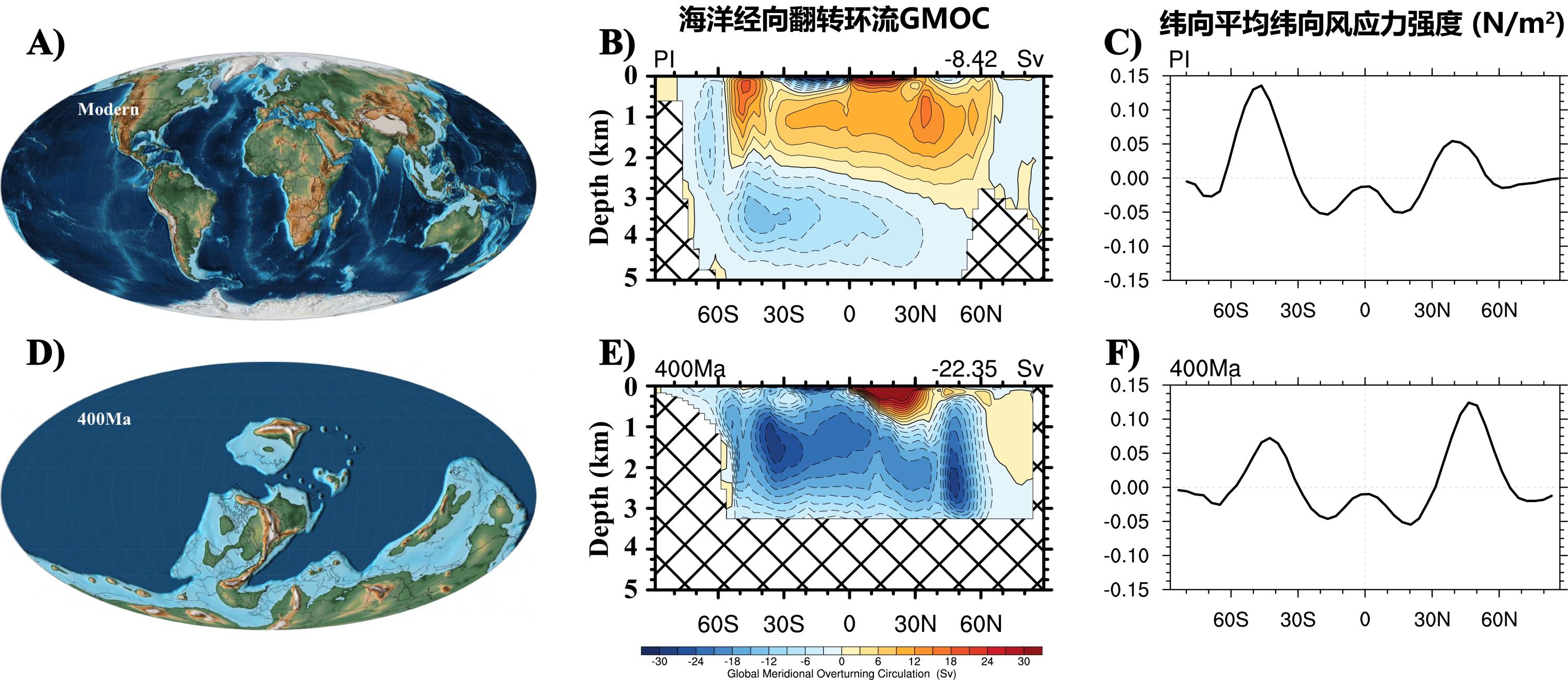 图1:现代和4亿年前的海陆分布、全球海洋经向翻转流和纬向平均风应力。上排:现代,下排:4亿年前。在B和E中,红黄色表示顺时针运动,蓝色表示逆时针运动。