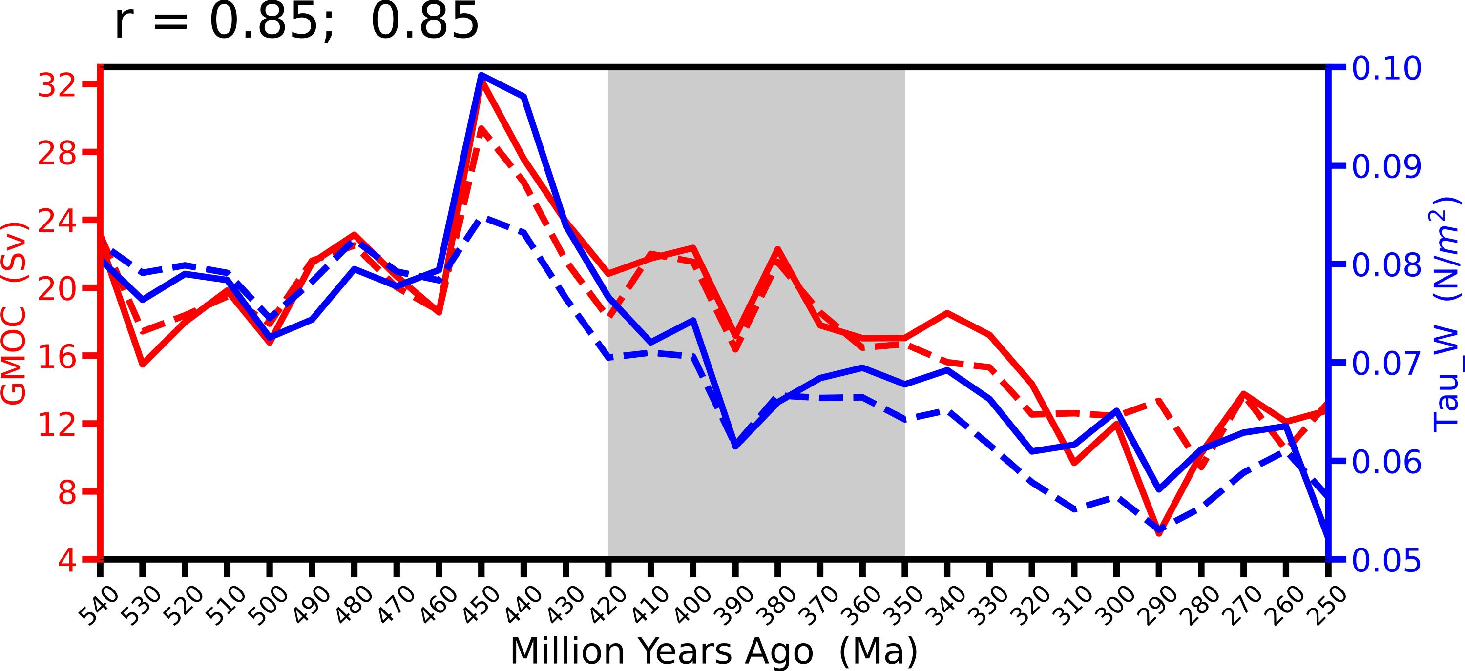 图2:GMOC强度和风应力演变。实线和虚线分别是Group I和Group II的结果。红线表示GMOC强度,蓝线表示北半球中纬度(30°N~60°N)纬向平均风应力。图片左上角标出了两组试验中GMOC强度与风应力的相关系数。