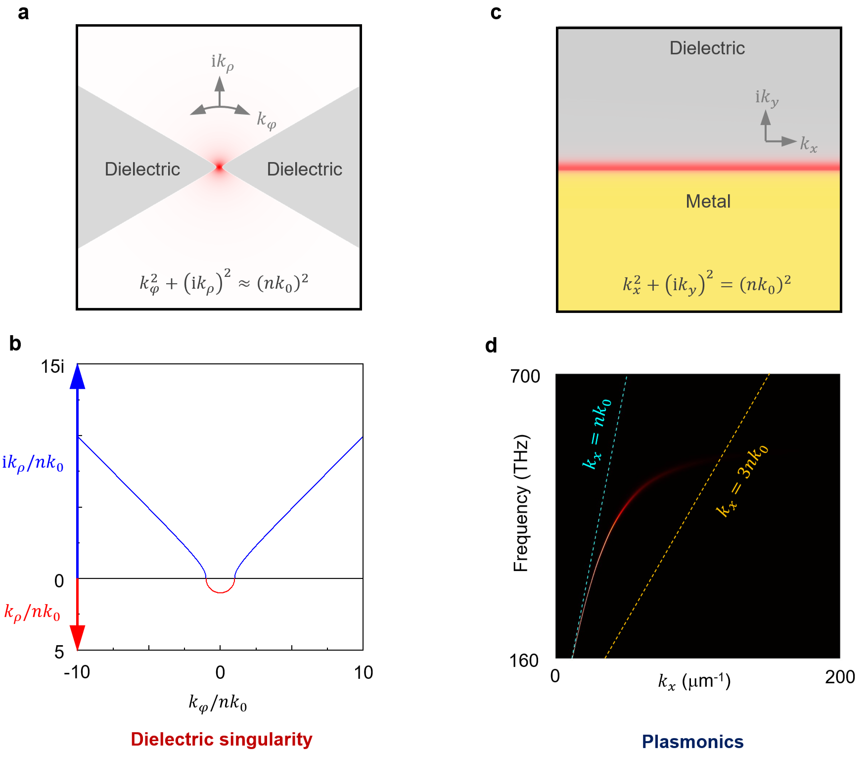图3.课题组基于麦克斯韦方程构建了介电质体系突破光学衍射极限的理论,发现介电蝶形纳米天线顶点处的电场奇点源自动量的发散(a-b)。该机制类似于等离激元模式的光场限制机制,但确没有欧姆损耗(c-d)。介电质体系中的电场奇点可以实现半高宽远小于1纳米的极端光场压缩。