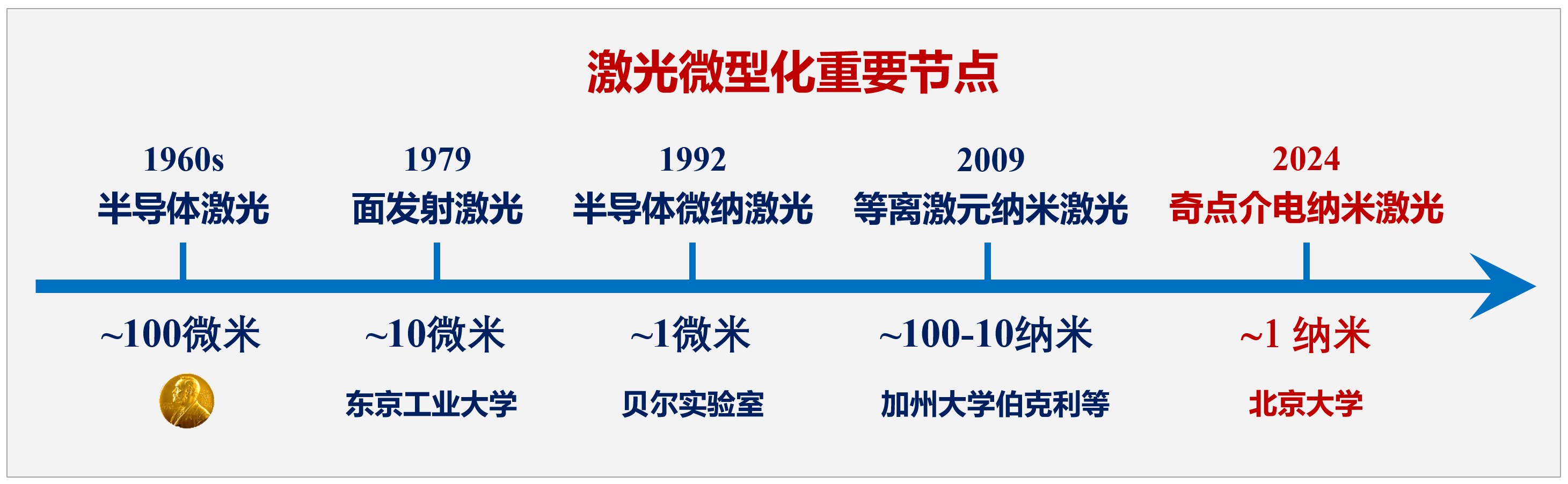 图1.激光微型化的重要节点。欧冠官方网站构建了介电质体系突破光学衍射极限的理论,发明了制备具有原子级特征尺度光学纳腔的新方法,首次提出并实现了奇点介电纳米激光,将激光特征尺度推进至原子尺度。