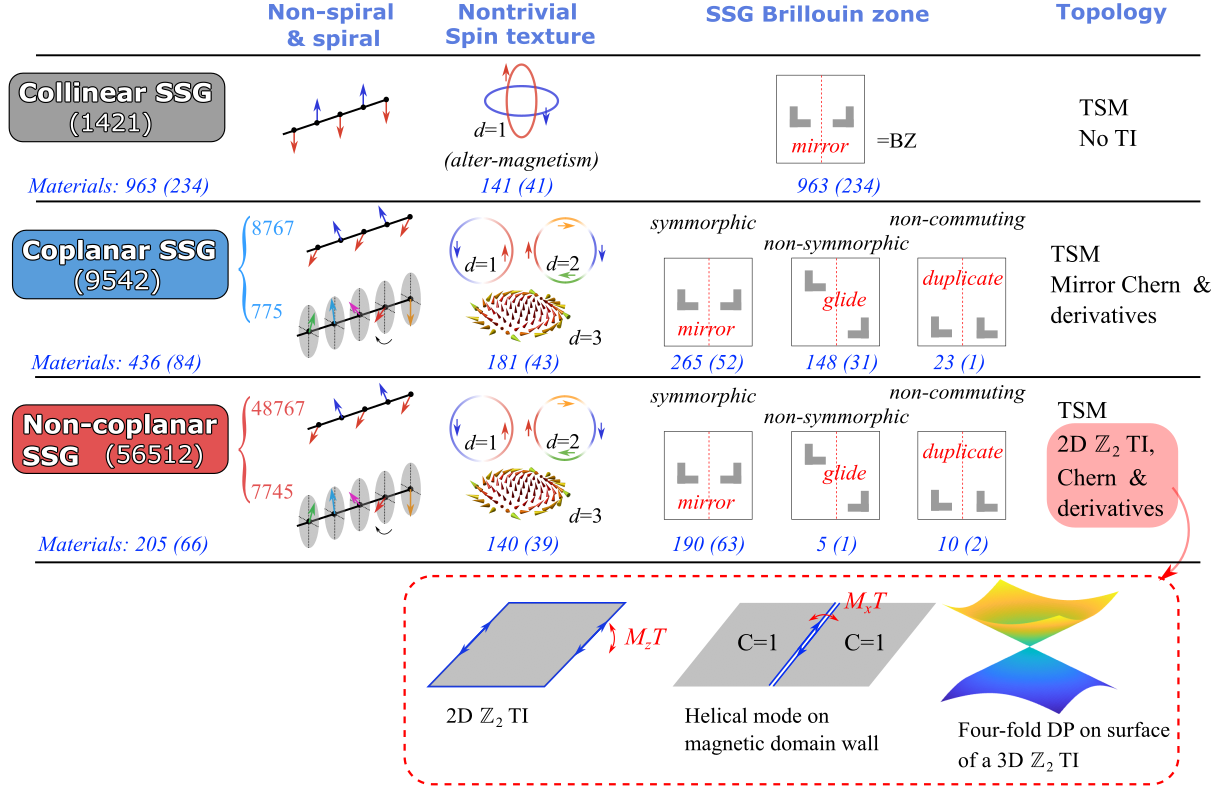 图.列一:共线、共面、非共面的自旋空间群的数目,以及实际相应的实际材料的数目。括号中为构成元素都在前四周期的材料的数目。第二列:螺旋和非螺旋自旋空间群的数目。第三列:可能的非平凡的自旋纹理,以及对应材料的数目。第四列:自旋群中的新奇电子能带结构,以及对应材料的数目。这些结构都由空间群的新型射影表示给出。第五列:自旋群中可能的拓扑电子态。