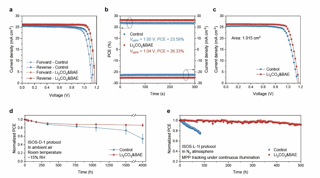 该策略通过协调界面分子与两侧功能层的键合强度,使界面分子最大程度地发挥调控作用,同时又缓解了界面分子对钙钛矿层的侵入和破坏。最终将钙钛矿太阳能电池的光电转换效率显著提升至26.5%以上(中国计量院认证值为26.31%),电池的迟滞效应也得到了明显改善。此外,研究团队也发现这一策略可以有效地稳定FAPbI3的光活性相,从而大大提升了钙钛矿太阳能电池在湿、热和光老化条件下的稳定性(图2)。