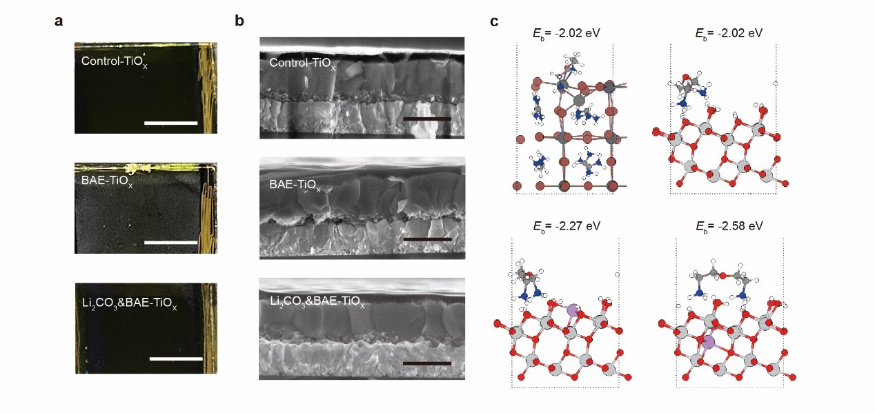 图1.不同处理策略所制备的钙钛矿太阳能电池:(a)背面光学照片;(b)截面扫描电镜照片;(c)界面分子与钙钛矿或金属氧化物电荷传输层的结合能(理论计算)。