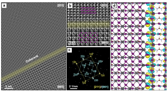 图2.原子尺度高分辨率冷冻透射电子显微镜(Cryo-TEM)图像及相干晶界。(a)钙钛矿[211]晶带轴与[001]晶带轴轴之间相干晶界的高分辨冷冻电镜图像;(b)相干晶界的放大图;(c)对应的快速傅里叶变换(FFT)图案;(d)相干晶界的理论原子模型。