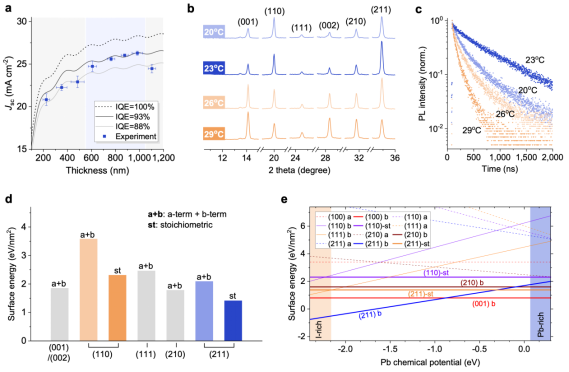 图1.调控高密勒指数晶面及相关机制。(a)短路电流密度随钙钛矿薄膜厚度变化的理论与实验值;(b)微米厚钙钛矿薄膜的X射线衍射图谱;(c)时间分辨光致发光谱;(d)DFT计算得到不同晶面取向钙钛矿的表面能;(e)不同化学势条件下的表面能。
