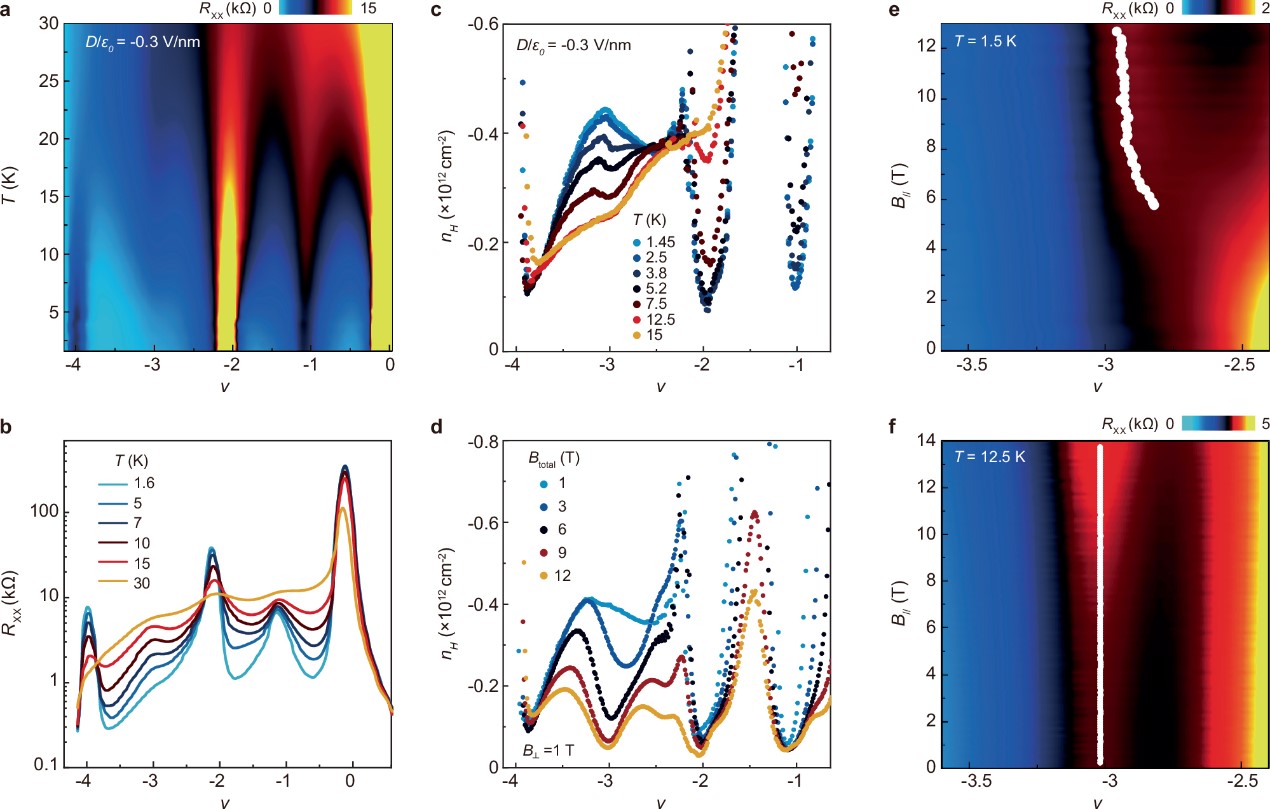 近日,路建明课题组与合作者通过构筑菱方三层石墨烯/氮化硼摩尔超晶格关联电子系统,在独立平带的分数填充时观测到对称性破缺关联绝缘体的反常温度依赖关系:每个摩尔超胞填充3个空穴时,关联绝缘态在高温(~15 K)时出现,在低温(~1.5 K)时消失;对于填充1或2个空穴的电子态,当电位移场大幅度削弱电子关联性时,可以观测到类似现象,表明极化态序参量较弱的刚性可能是此反常效应的关键因素。目前,平带体系中对称性破缺极化态的反常温度效应背后的物理机制仍然有待被彻底理解,研究团队的实验结果将会促进相关理论的进展。
