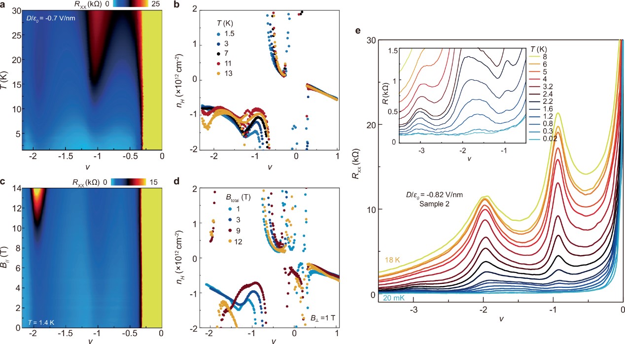 图四填充因子为-1和-2的区域,当电位移场较大时,电阻峰和载流子“重置”行为也有类似的温度和平行磁场依赖关系。