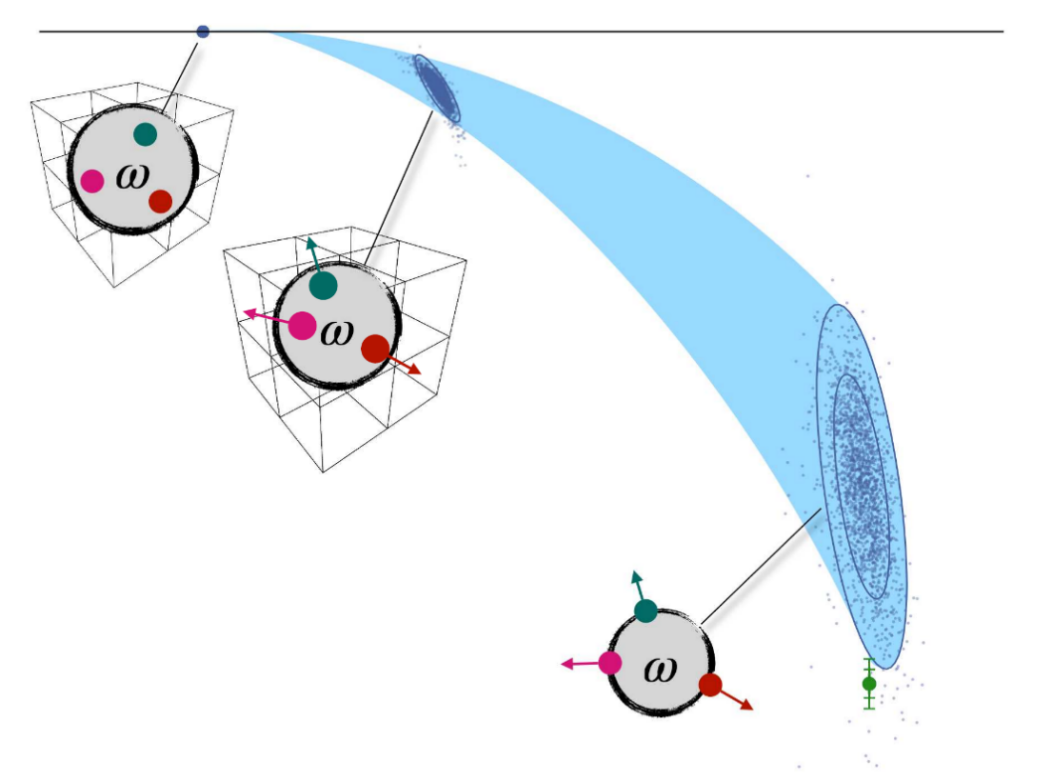 图:ω介子的谱性质(质量和半宽度)可以用ω介子在复能量平面上的极点位置标记。该性质是通过考察三个π介子在一个有限体积中的散射来确定的(左上角的两个包含格点示意图标,其中的三个圆点代表三个π介子)。蓝色的带子则示意了按照有效场论进行无穷体积和π质量外推到物理点的情况。带子左上角的两个蓝色椭圆都是在有限体积下计算的极点位置;带子右下角的两个椭圆则代表了外推到物理点的位置,实验结果由绿色的点给出。