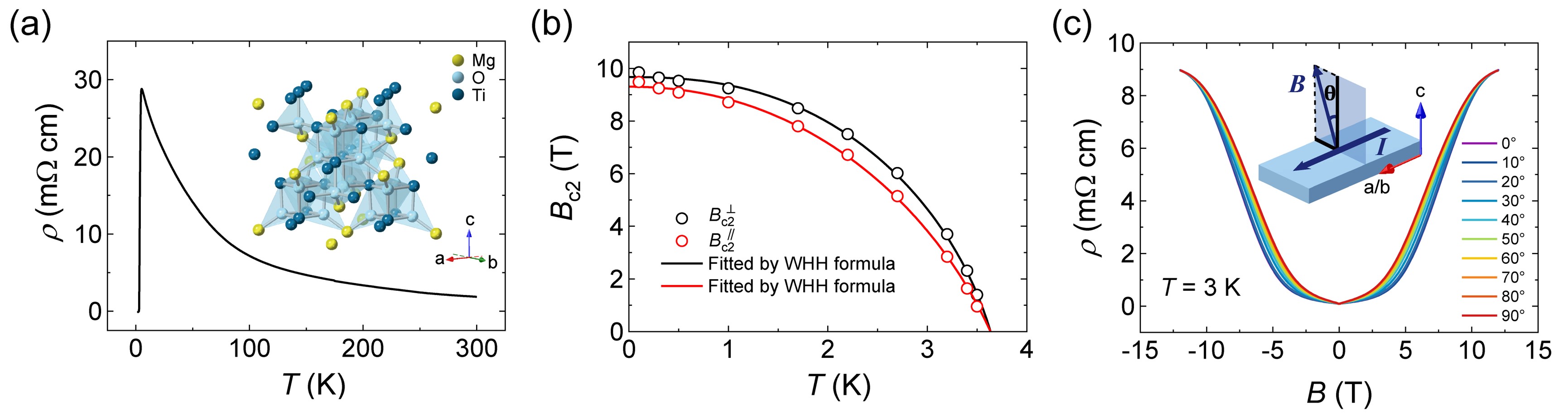 图1:(a)零磁场下MgTi2O4的超导转变曲线;(b) MgTi2O4的垂直与平行上临界场随温度的依赖关系;(c)不同角度磁场下的磁阻曲线。
