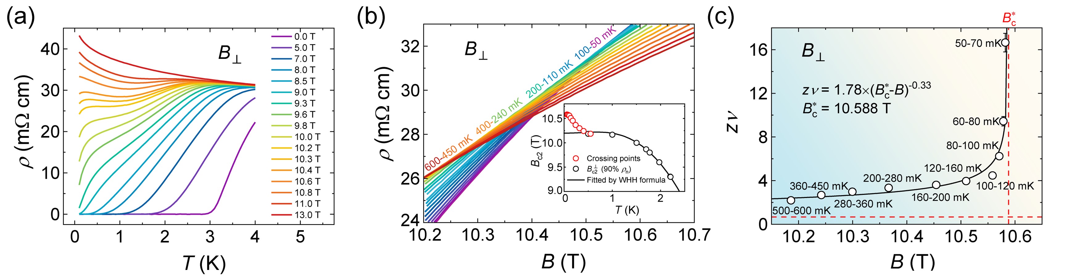 图2:(a) MgTi2O4中磁场诱导的超导-绝缘体相变;(b)不同温度下的等温磁阻曲线交于一个区域;(c)三维量子格里菲斯奇异性的主要实验证据:临界指数zv在趋于量子临界点时发散。