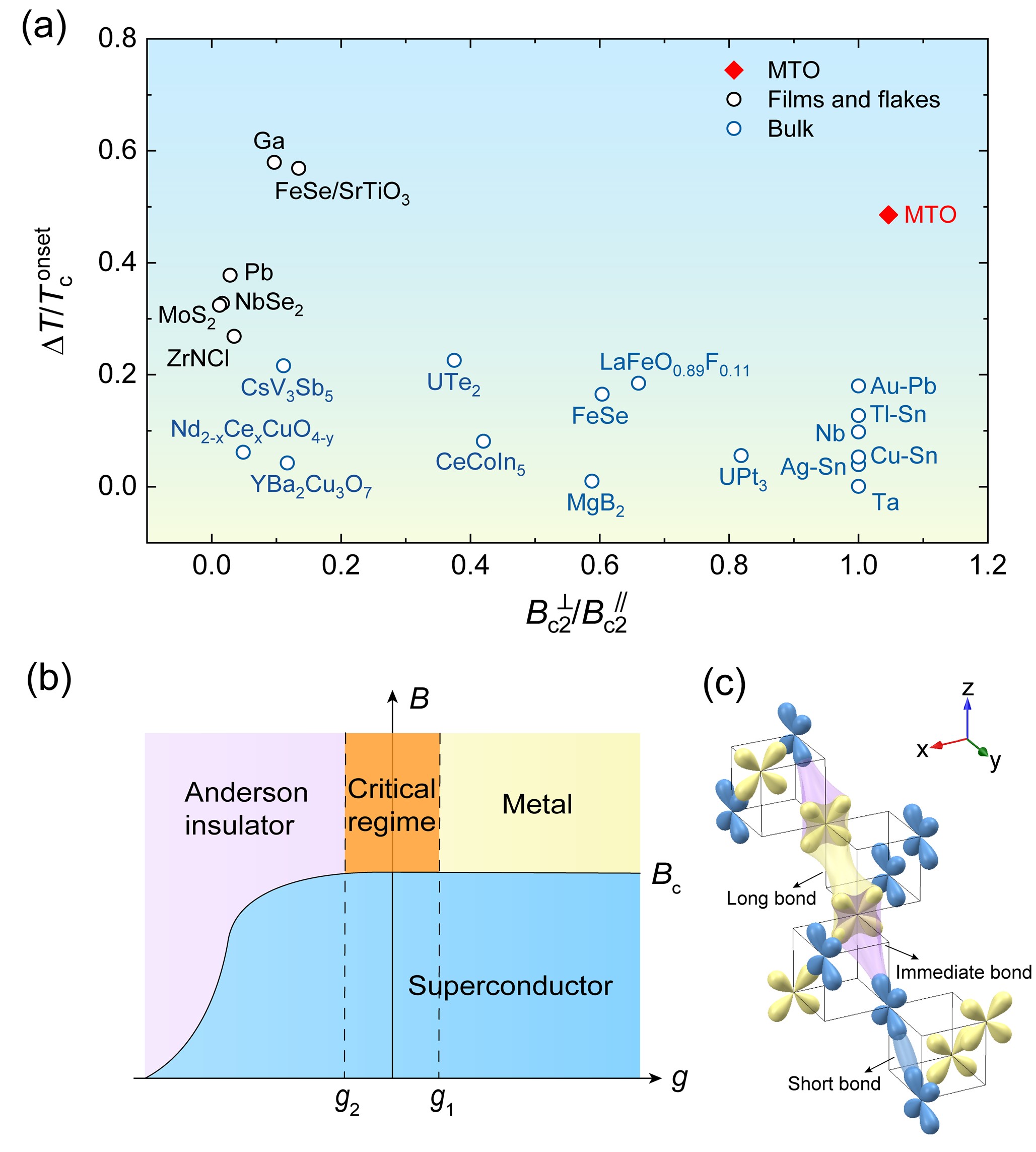 图3:(a)不同超导体系的超导转变区域相对宽度和临界磁场各向异性;(b)三维系统中的超导与安德森局域化相图;(c)MgTi2O4中的轨道序示意图。