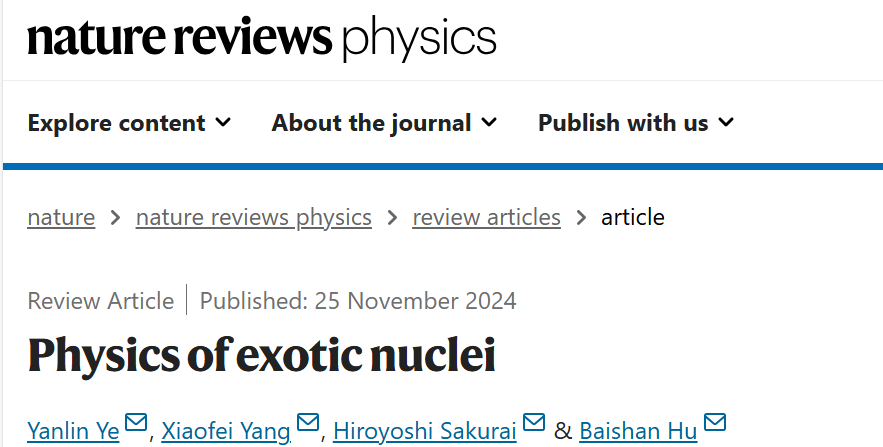 近日,应《自然综述·物理》(Nature Reviews Physics)杂志邀请,欧冠官方网站、核物理与核技术国家重点实验室叶沿林教授和杨晓菲教授联合日本理化学研究所仁科加速器科学研究中心Hiroyoshi Sakurai教授和美国橡树岭国家实验室胡柏山博士后研究员,共同发表了题为“奇特原子核物理”(Physics of exotic nuclei)的综述文章。
