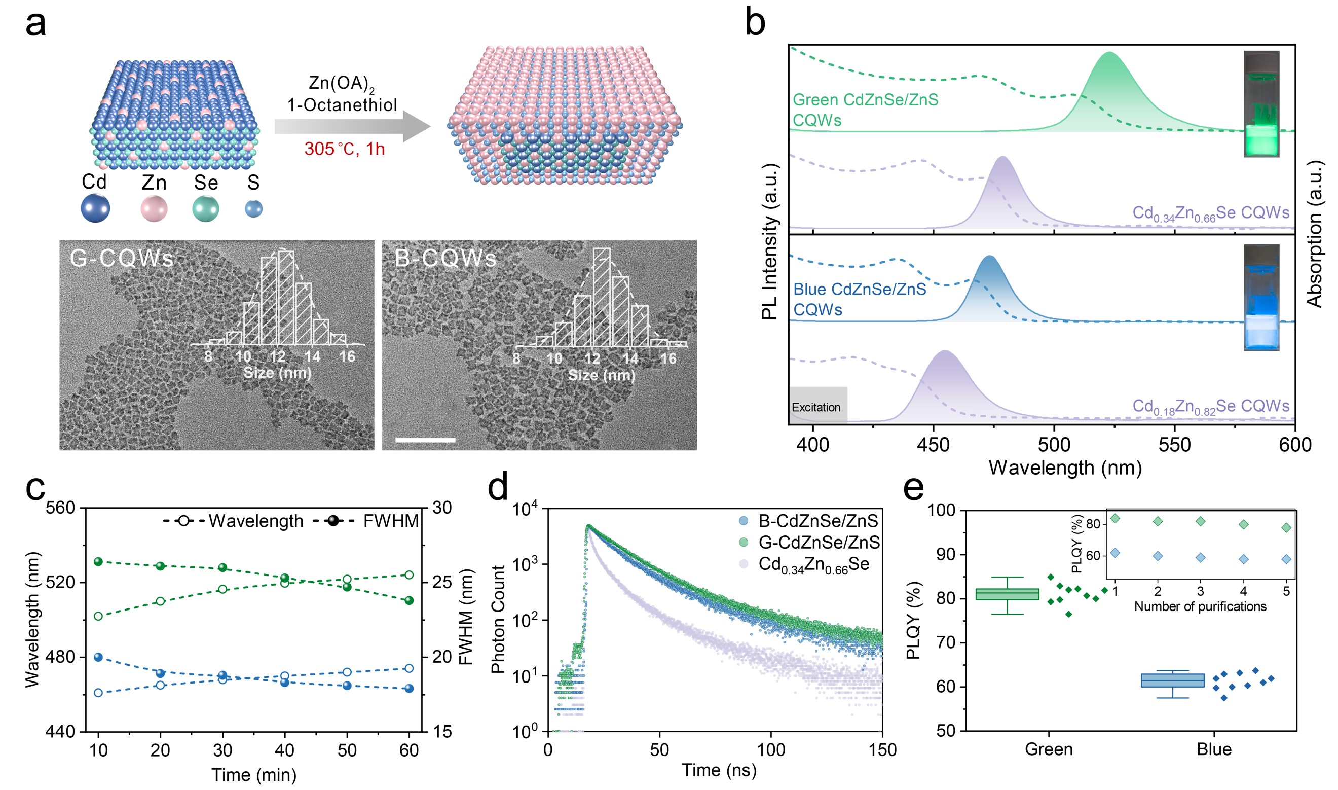 图2.高温热注入壳层生长示意图。(a)CdZnSe/ZnS核壳CQWs合成示意图。(b) CQWs溶液的吸收光谱和光致发光光谱。c) 反应过程中荧光峰波长和半宽的变化。d) CQWs的瞬态荧光衰减曲线。e)绿色和蓝色CQWs的荧光量子产率。
