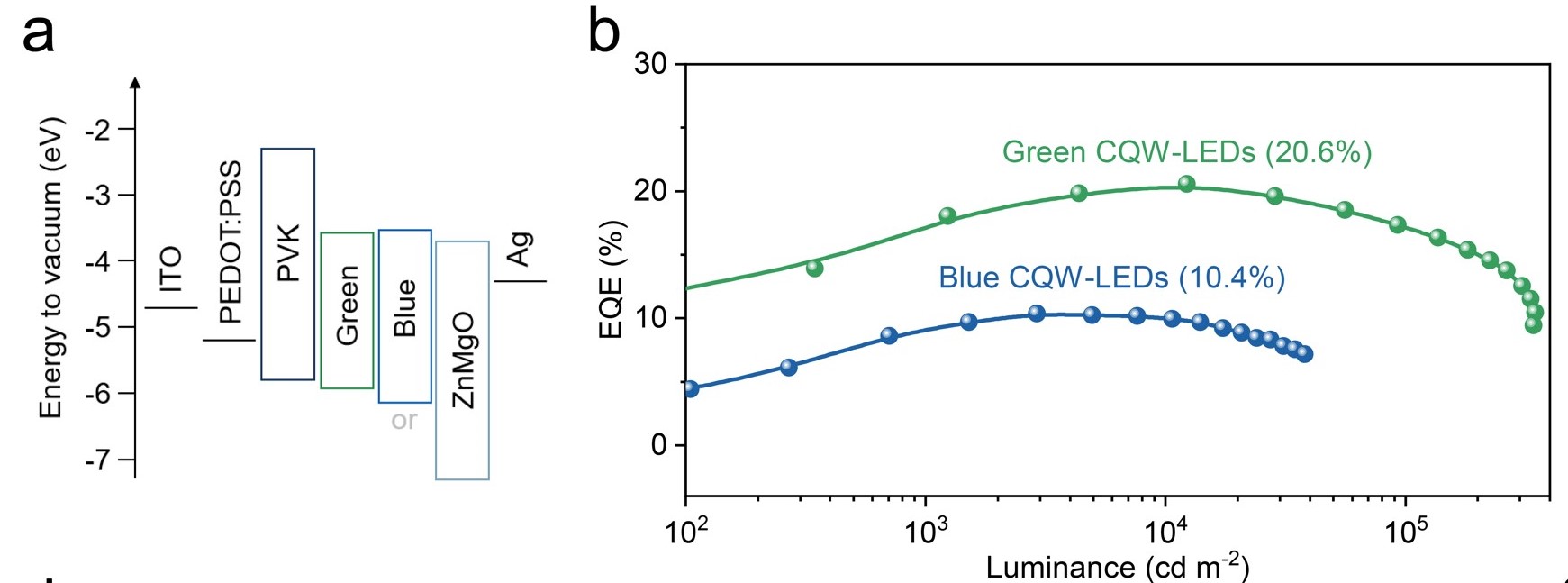 图3. a)器件结构示意图。b)器件外量子效率-亮度示意图。