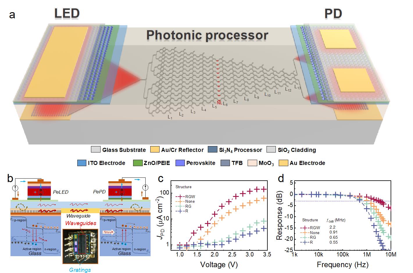 图1.单片异质集成的钙钛矿/氮化硅光子芯片系统。(a)异质集成片上钙钛矿/氮化硅光子芯片系统的结构示意图;(b)单片集成的钙钛矿发光二极管、光电探测器和氮化硅波导网络的工作原理示意图,插图展示了拍摄的单片集成芯片光子系统照片;(c)不同结构的光电流-驱动电压曲线;(d)不同结构的系统频率响应。