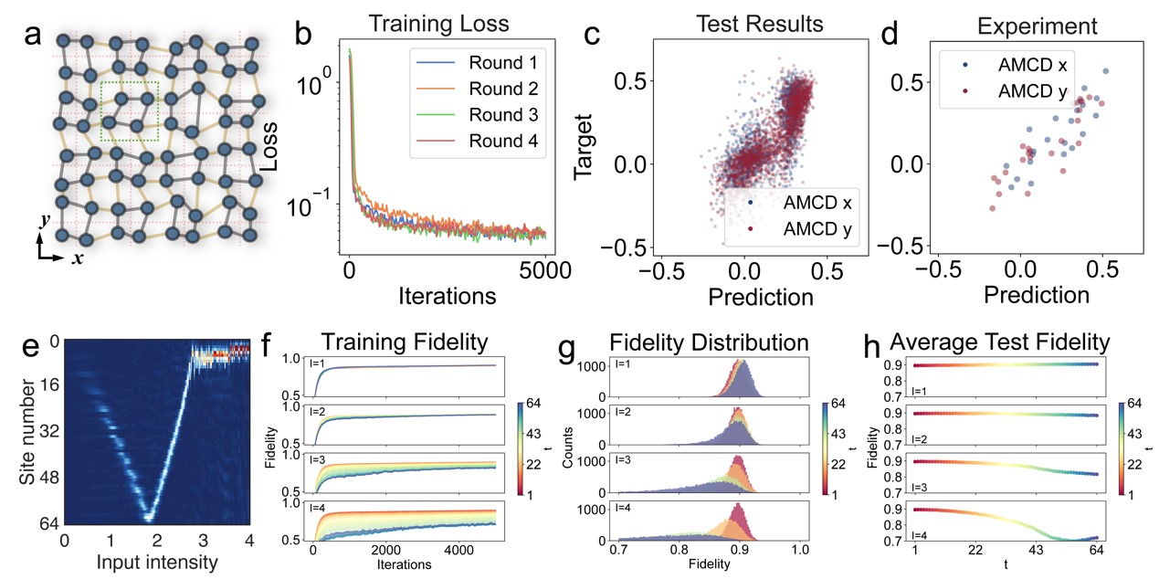 图2.光子神经网络用于计算二维无序拓扑模型的拓扑不变量和模拟非线性拓扑系统的演化。(a)二维无序SSH模型示意图;(b)网络四个不同初始化的训练损失曲线;(c)网络的第一轮训练的测试集结果;(d)从测试数据集中随机取出的24个样本的实验测量结果;(e)给被非线性调制的系统施加边界输入,在时间T=64时波函数的分布;(f)模拟64个不同时间步长上的训练保真度曲线;(g)测试集上的保真度分布;(h)测试集上所有时间步长的平均保真度分布。