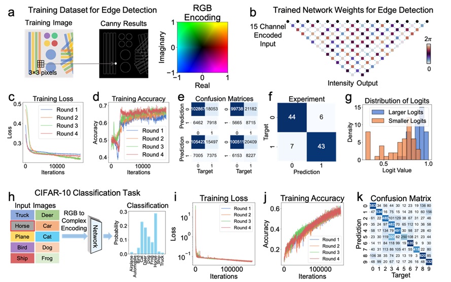 图3.光子神经网络用于图像边界检测和图像分类任务。(a)将3×3图像块编码为复振幅,色相表示相位,亮度表示强度,目标来自Canny数据边界检测;(b)网络构型及第一轮训练中的权重分布;(c)边界检测的训练损失函数曲线;(d)边界检测的训练准确率曲线;(e)边界检测的测试集混淆矩阵;(f)实验测得的边界检测混淆矩阵;(g)实验测得的边界/非边界分类的输出分布。(h) CIFAR-10图像分类任务;(i) CIFAR-10分类的训练损失曲线;(j) CIFAR-10分类的训练准确率曲线;(k) CIFAR-10测试集上的混淆矩阵。