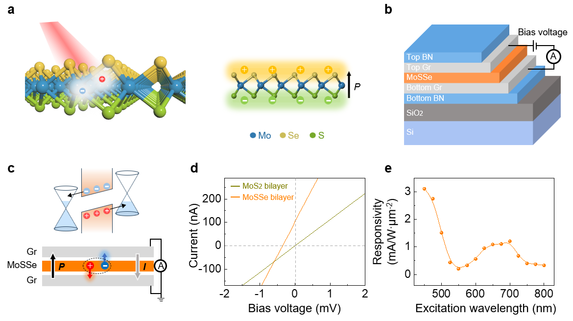 图1. a-b, Janus MoSSe单层结构及自发光伏器件示意图。c,器件能带和光生载流子转移过程示意图。光电流方向与极化方向相反。d, MoSSe双层和MoS2双层光电器件的响应对比。e,光电流响应随激发波长的变化。