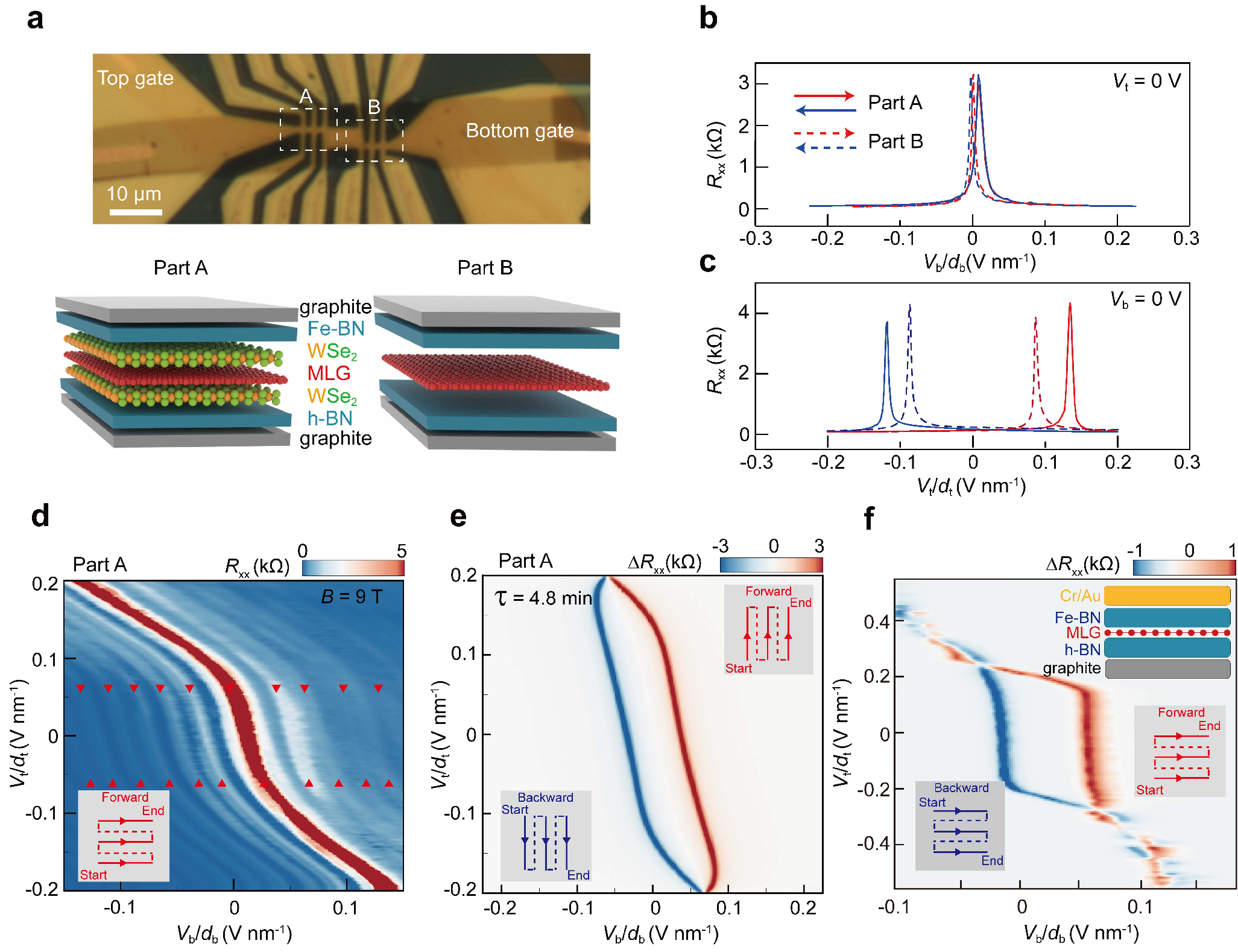 图2.人工构造多层转角MoS2作为栅极一部分,非易失性调控单层石墨烯电阻,复现库伦屏蔽型铁电现象。