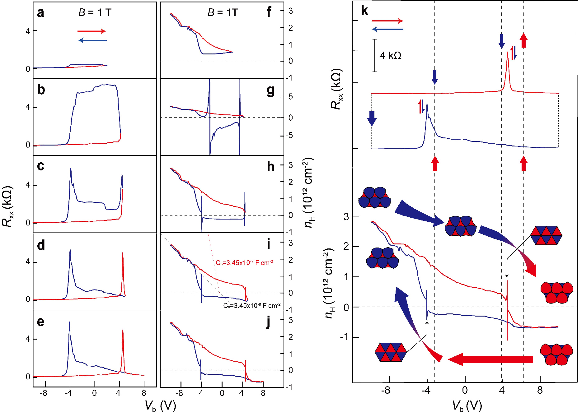 图3.栅极调控过程中的“惯性”行为,与瞬时响应的电子行为相悖,预示着器件中存在晶格移动。右图展示了不同晶格堆叠极化态与石墨烯电阻之间的对应关系。