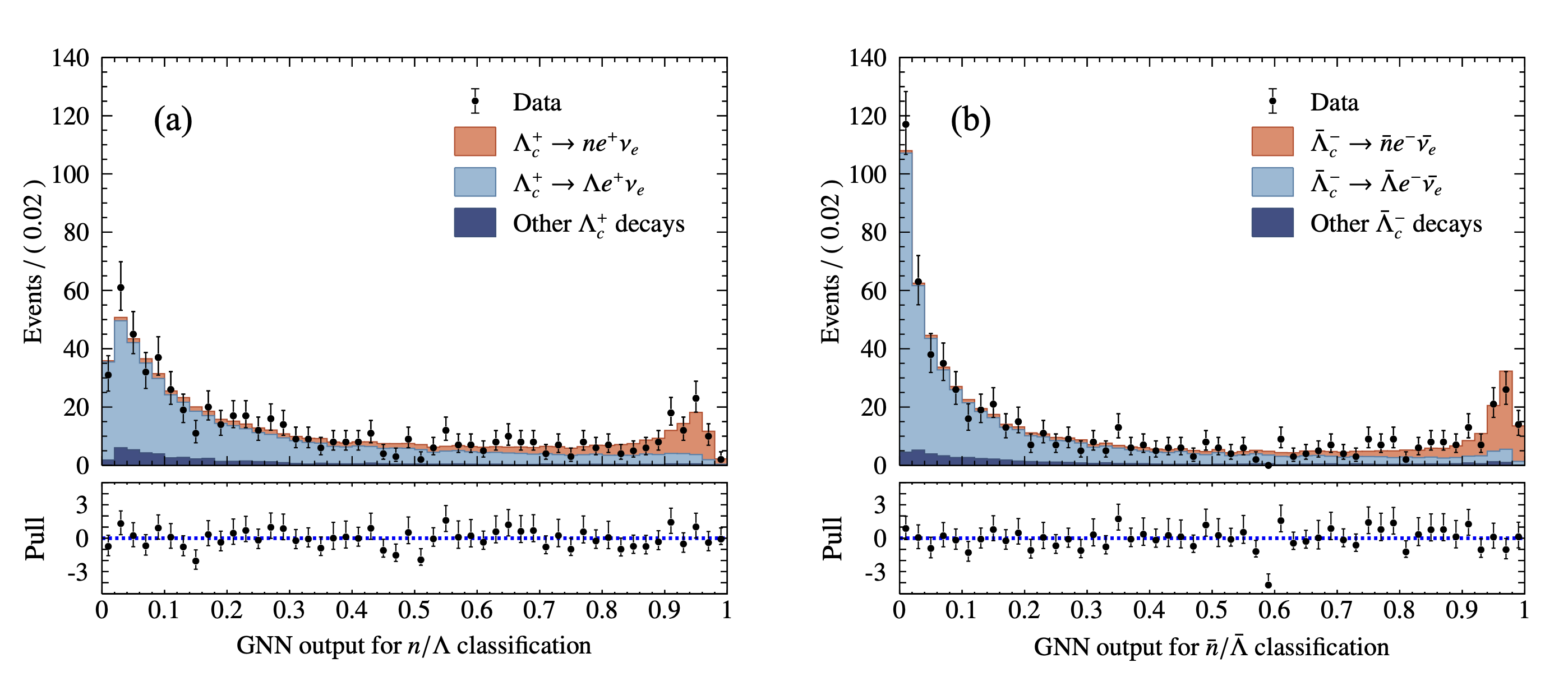 近日,欧冠官方网站技术物理系、核物理与核技术国家重点实验室高能物理团队冒亚军、王大勇课题组与合作者基于北京谱仪III(BESIII)实验采集的正负电子对撞数据,利用深度学习技术,以超过10倍标准偏差的统计显著度首次观测到粲重子Λc+衰变为中子、正电子与电子中微子的半轻衰变过程。相关研究论文以“使用图神经网络观测粲重子的稀有贝塔衰变”(Observation of a rare beta decay of the charmed baryon with a Graph Neural Network)为题,于2025年1月15日发表于《自然•通讯》(Nature Communications)。