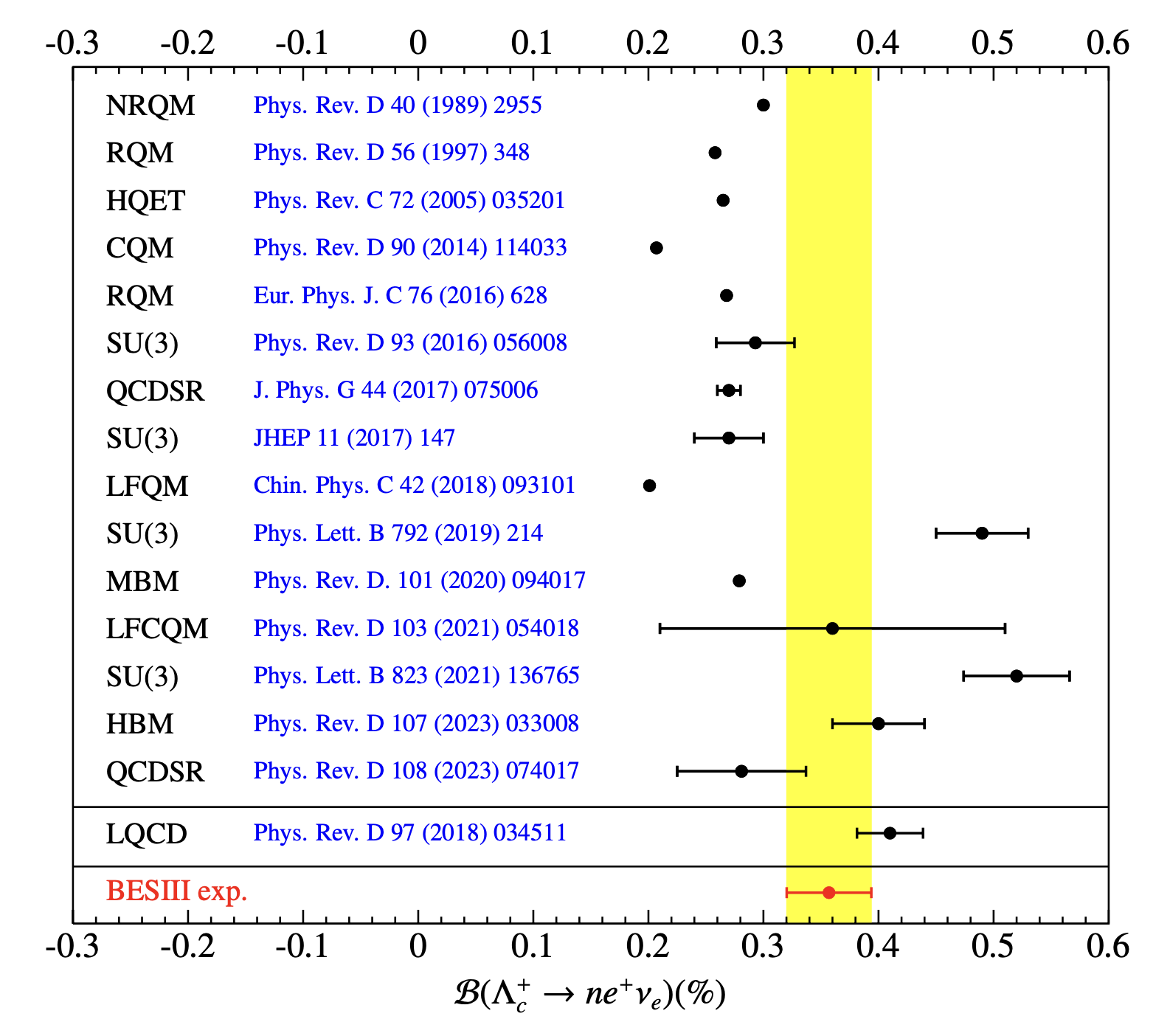 图3. 本研究测量的Λc+ → ne+νe衰变分支比与各类理论模型预言的比较