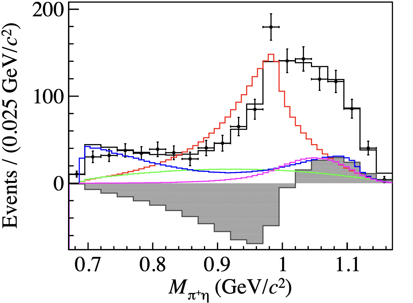 图2. 左图是基准模型的拟合结果在π+η不变质量谱的投影图,其中红色线代表Λc+→Λa0(980)+过程。右图是包含Σ(1380)+的模型的拟合结果在Λπ+不变质量谱的投影图,其中浅蓝色线代表Λc+→Σ(1380)+η过程