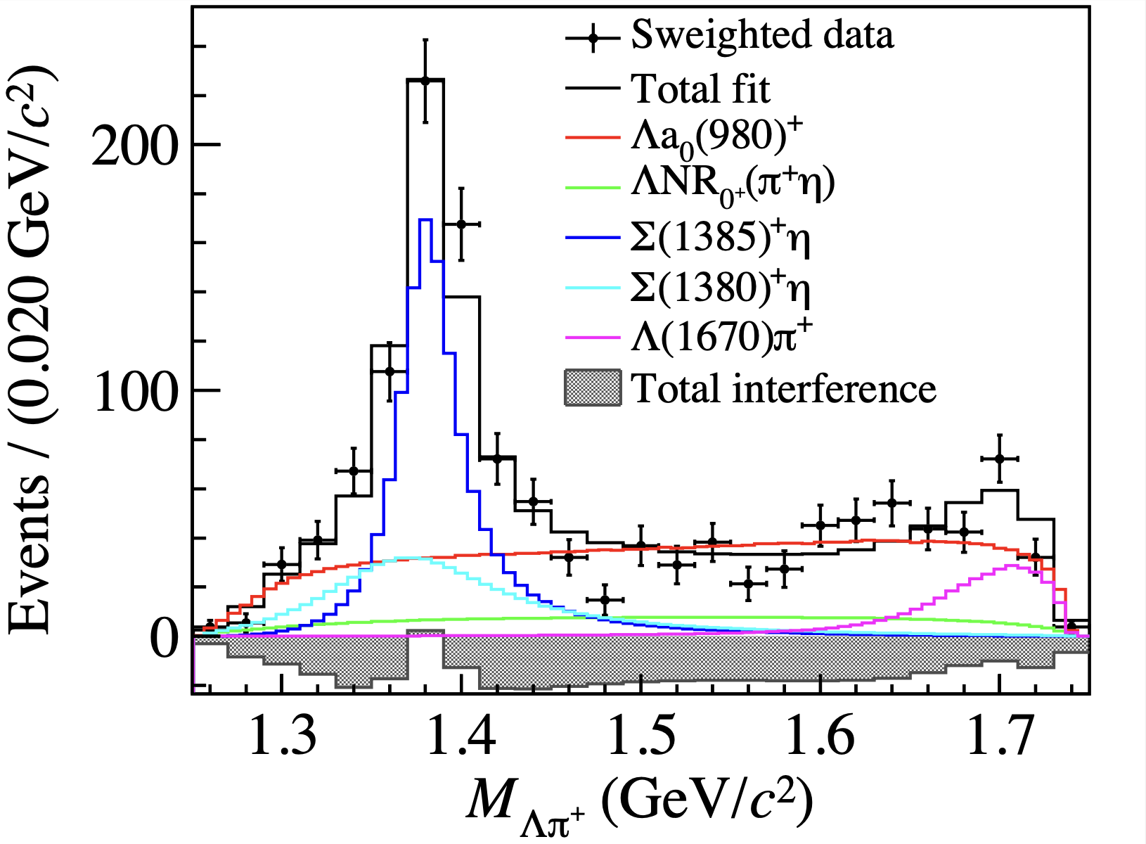 在微观世界中,夸克通过强相互作用力束缚形成强子。根据夸克模型,自然界存在两类常规强子:两个夸克组成的介子(如π介子)和三个夸克组成的重子(如质子和中子)。此外,理论还预测了更加复杂的强子结构,例如:四夸克或五夸克以紧致形式结合而成的强子态;强子-强子间松散结合形成的强子分子态。这些非常规粒子被统称为奇特强子态,对它们的研究有助于深化对强相互作用理论的理解和检验。轻标量介子a0(980)+是粒子物理研究中的受到最广泛关注的奇特强子态之一。然而,学界对其内部性质尚存争议,包括两夸克介子、紧致四夸克态、以及阈值效应等不同理论解释。另一方面,基态负宇称的超子Σ(1380)+也是一种奇特强子态,其内部可能由五个夸克组成,但此前从未被实验直接观测到。理论上,粲重子Λc+的两种特定衰变模式(Λc+→Λa0(980)+和Λc+→Σ(1380)+η)为研究上述奇特强子态提供了新途径。早在2019年,研究团队已在BESIII实验上首次测量了Λc+→Λπ+η过程的绝对衰变分支比,并在Λπ+不变质量谱上发现Σ(1385)+粒子。然而,由于当时实验数据量的限制,其他可能的中间共振态未能得到系统研究。在2020-2021年期间,BESIII实验在正反Λc对质量阈值附近采集了约10倍于以往的数据。本次研究成果正是基于这些新的实验数据完成的。