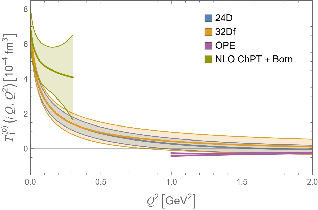北大团队采用了接近物理点的规范场组态进行研究,并创新性地引入了优化的减除点,从而显著提高了计算精度。研究表明,核子-π介子中间态引起的有限体积效应和时间截断效应在计算中占有重要地位,这些效应也曾在北大团队此前关于核子电极化率的研究(DOI: 10.1103/PhysRevLett.133.141901)中产生过显著影响。在前期研究的基础上,北大团队完整地计算了核子-π介子中间态的贡献,并有效控制了相关的系统误差,首次给出了精确的减除函数计算结果。这些结果可与手征微扰理论在低动量区域的预测及算符乘积展开在高动量区域的结果进行对比(如图所示)。可以看出,格点QCD的计算结果显著提升了非微扰低能区的理论预言精度。