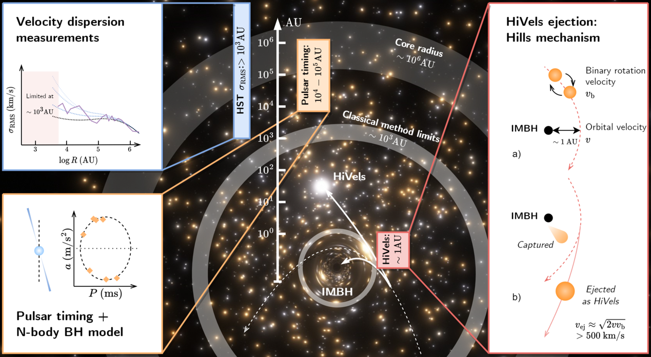 球状星团被认为是中等质量黑洞最理想的潜藏场所。由于球状星团中心极高的恒星密度,IMBH可以通过两种方式形成:一种是恒星的反复并合形成一个(超)大质量恒星后,再塌缩成黑洞(快速模式);另一种是一些恒星级的小黑洞的反复并合,形成一个中等质量的黑洞(慢速模式)。早在本世纪初,科学家们就利用哈勃空间望远镜(HST)搭载的超高空间分辨率的太空望远镜影像摄谱仪对球状星团M15进行了观测,获得了其视向速度弥散曲线。结合N体数值模拟建模,研究人员限制得出M15中心可能存在一个重达1700至3200太阳质量的中等质量黑洞。然而,该结果发表后,许多研究团队提出了质疑:HST测得的视向速度弥散曲线距离星团中心仍有0.5角秒(对应星团位置约5200 AU),在此范围内除了中等质量黑洞外,还可能有数千颗致密星。近来,科学家利用HST历年来拍摄的500余幅图像,在半人马座欧米伽星团中发现了7颗束缚的高速星。这一发现被解释为可能需要一个中等质量黑洞(IMBH)来束缚这些恒星。然而,这些恒星距离星团中心最近的位置仍超过1000 AU。后续研究还利用脉冲星计时方法报道了球状星团中存在中等质量黑洞的迹象,但由于所用脉冲星距离星团中心更远,同样面临无法排除为一群致密星的可能性。因此,如何找到有效的方法在距离球状星团中心尽可能近的位置探测中等质量黑洞,成为了确定中等质量黑洞存在证据链的最后一环(参见图1的测量原理示意图)。