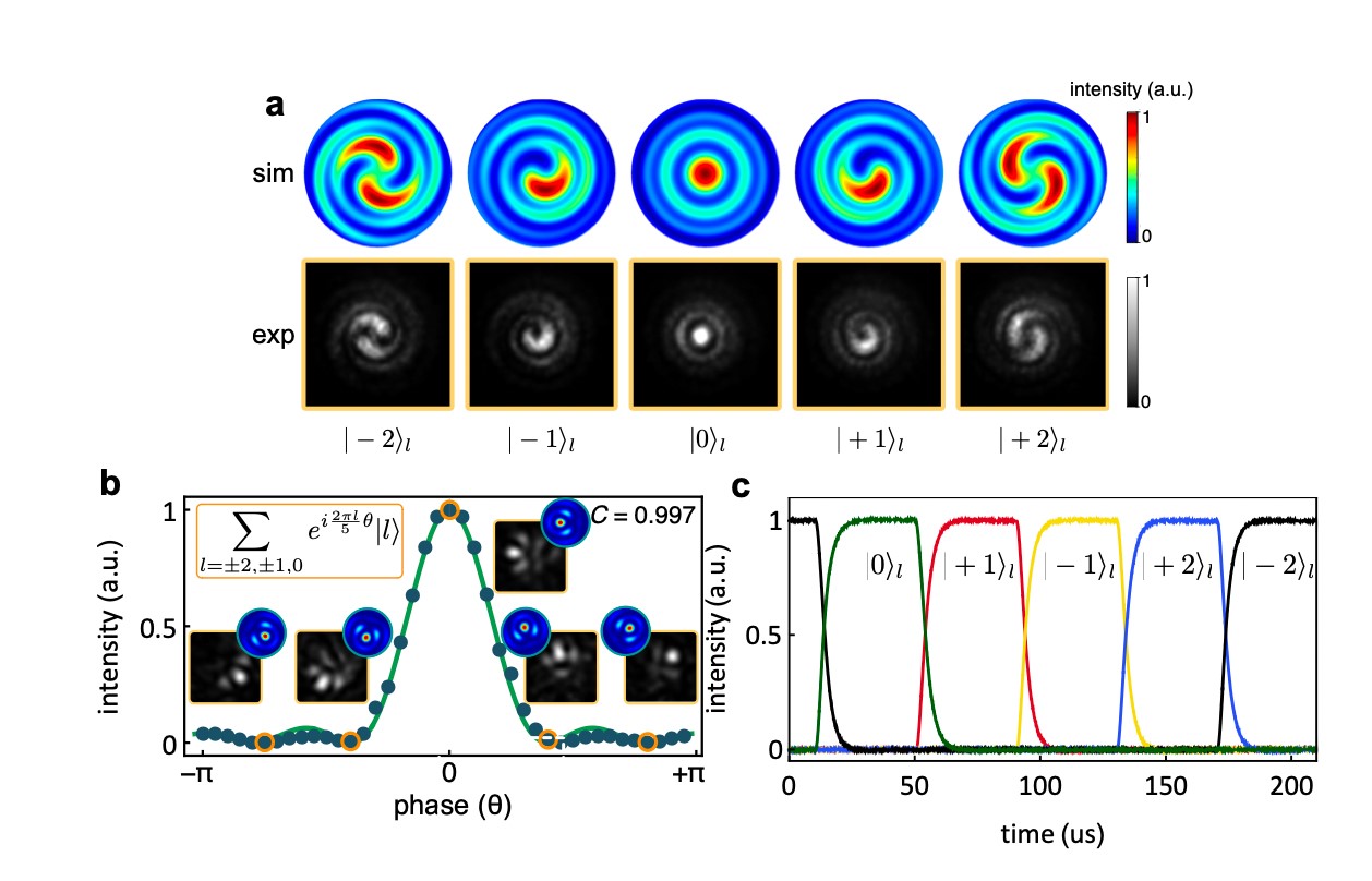 图2. OAM叠加态的经典表征调控。(a) OAM本征模式-高斯模式的共轴干涉图案;(b)不同相位角的OAM五维叠加态;(c) OAM动态调控。