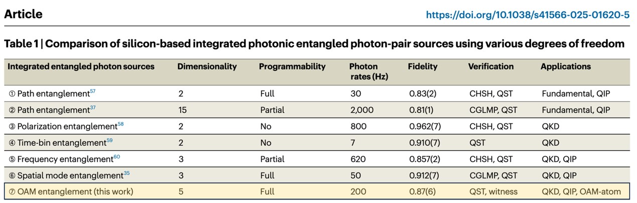 表1: 基于集成光量子芯片的不同自由度量子纠缠态,包括路径纠缠、偏振纠缠、时间纠缠、频率模式纠缠、空间模式纠缠、轨道角动量模式纠缠(本项工作)。